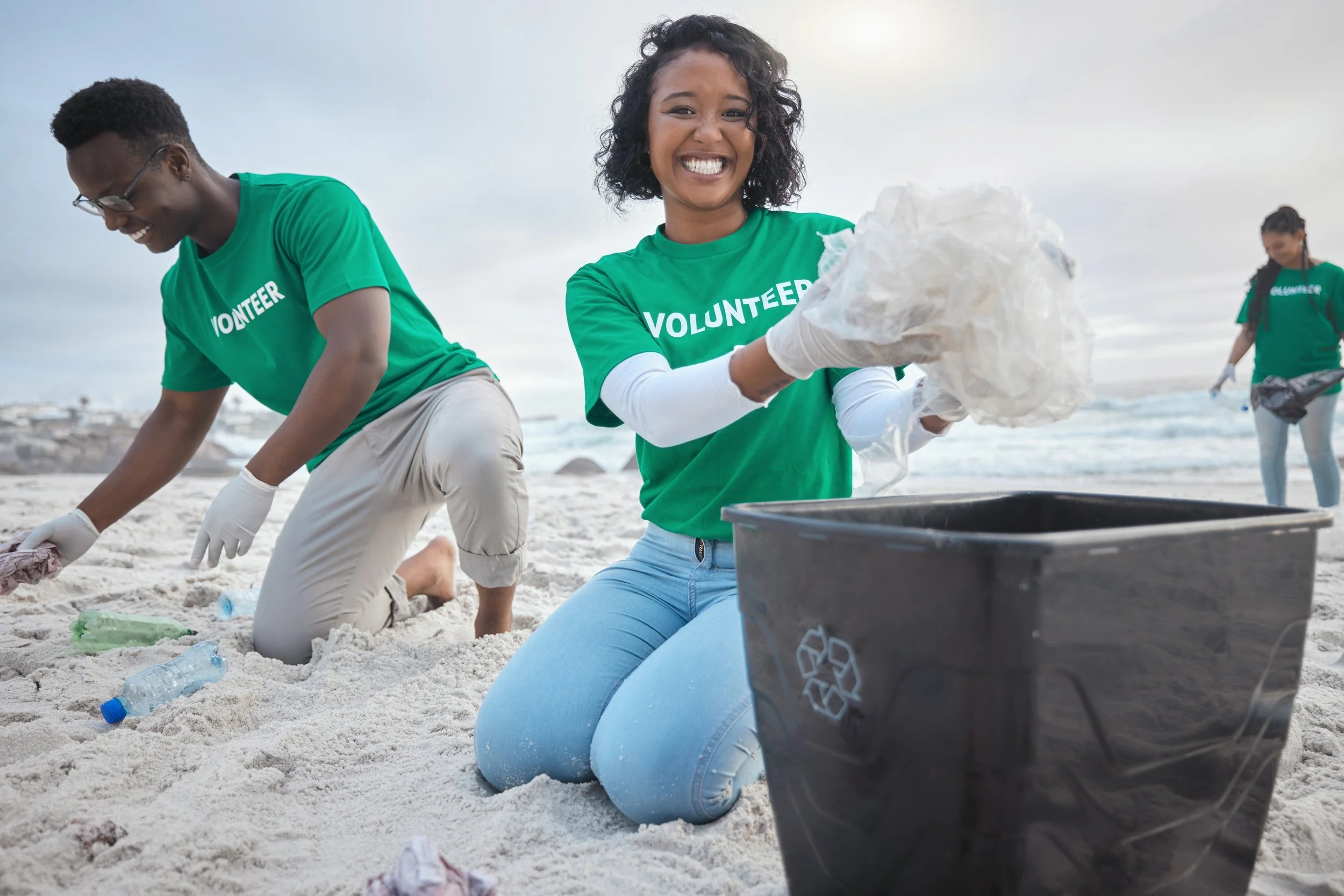 Group of volunteers in green shirts cleaning up trash on a beach, with one woman holding a large piece of trash and smiling at the camera.